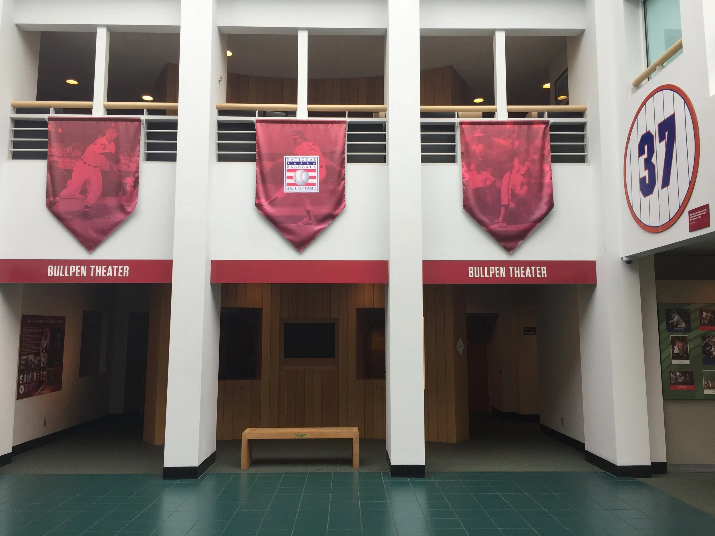 The theater, which features dramatic murals of great relief pitchers on its walls, has a giant video screen, with a computer built into the top of the podium for presentation fun.